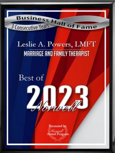 NORWELL October 21, 2023 – Leslie A. Powers, LMFT has been selected for the 2021 Best of Norwell Award in the Marriage and Family Therapist category by the Norwell Award Program.